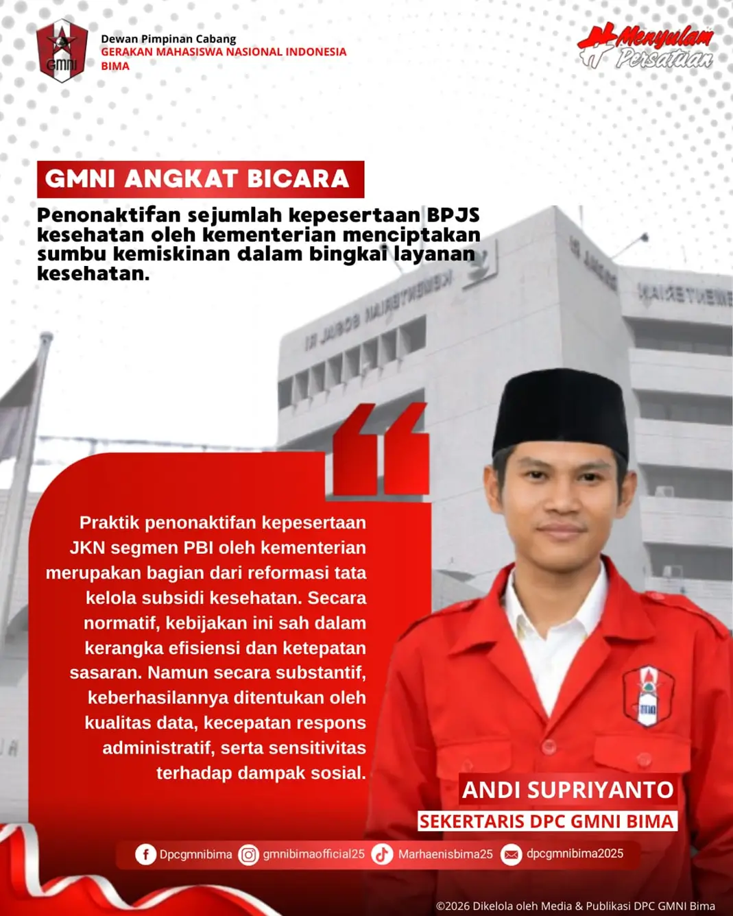 GMNI Kabupaten Bima juga menyoroti bahwa skema PBI JK merupakan bentuk nyata prinsip gotong royong, di mana negara menanggung iuran bagi masyarakat miskin dan rentan. Penonaktifan peserta secara sepihak dianggap menjadi tantangan serius bagi stabilitas sosial dan ekonomi masyarakat di daerah.